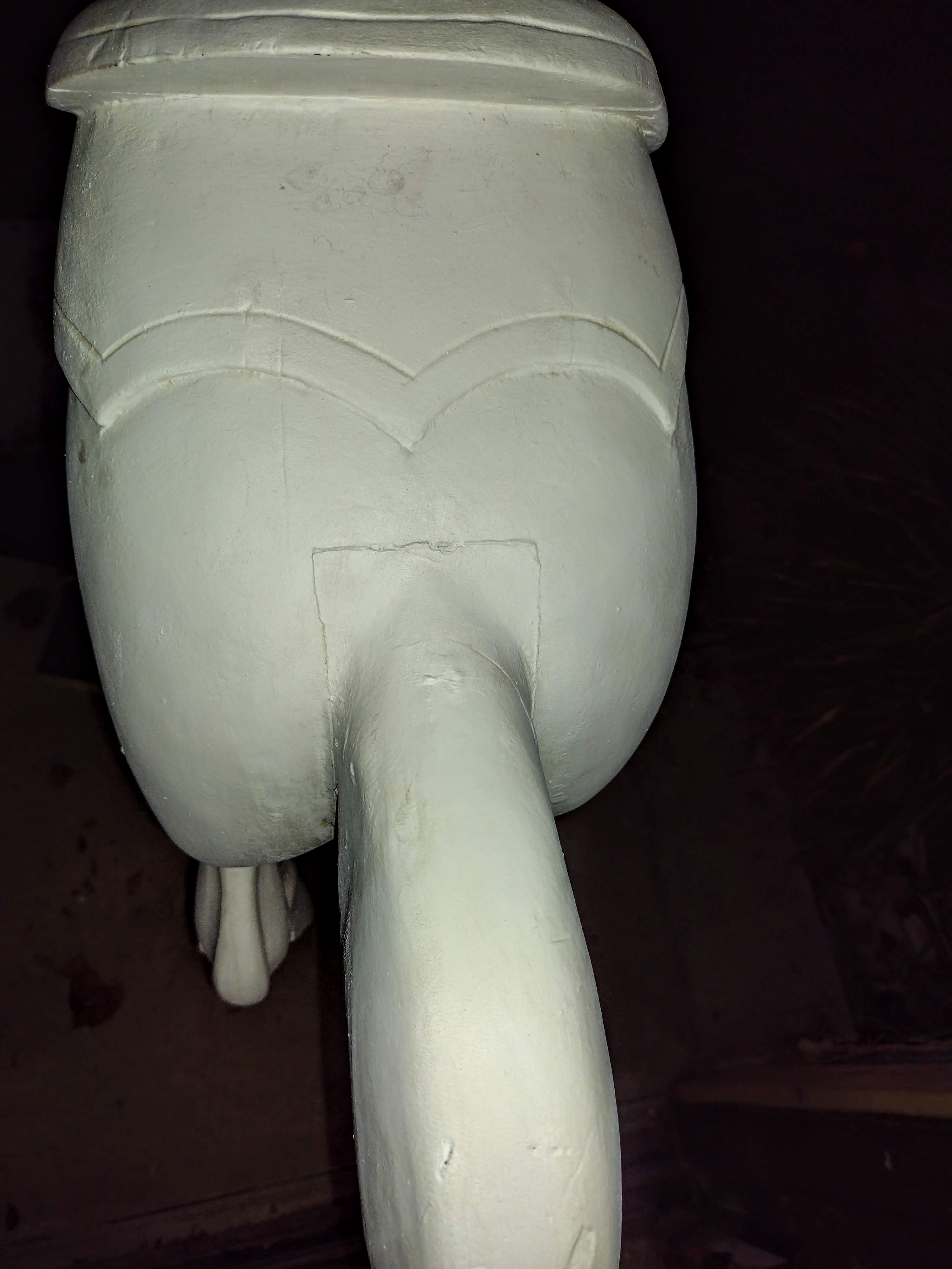 The horse is in primer, an older restoration, some cracks showing at some seams, and needs sanding before painting. All wood, wood eyes, wood tail,
